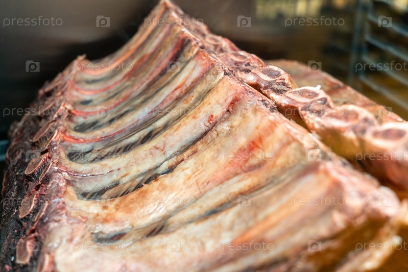 Мраморная говядина сухой выдержки лежит в холодильнике в ресторане. Мясо говядины сухой выдержки, выдержанное в течение месяцев в горячем ящичном холодильнике