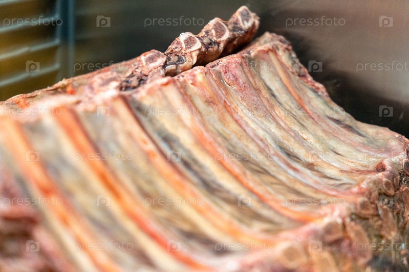 Мраморная говядина сухой выдержки лежит в холодильнике в ресторане. Мясо говядины сухой выдержки, выдержанное в течение месяцев в горячем ящичном холодильнике