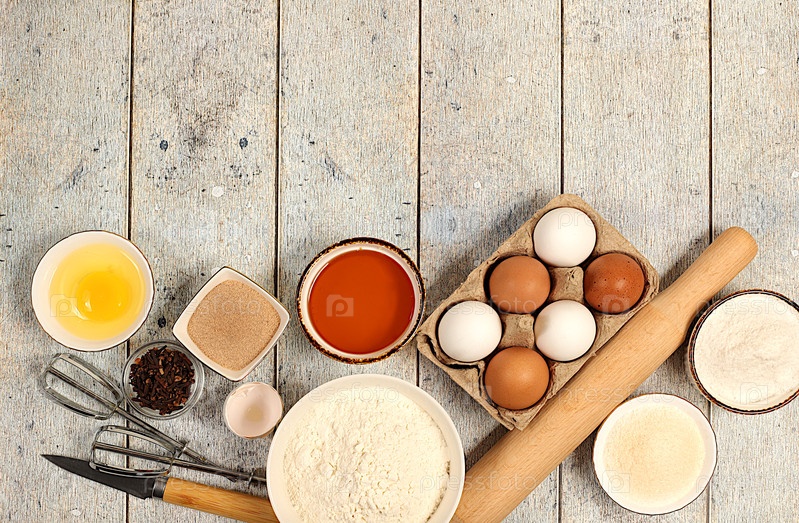 Фон кухни приготовления пищи с пространством для текста. Кулинарные ингредиенты для приготовления пирога и хлеба, рецепт с яйцами, мукой, сахаром, медом, корицей, дрожжами и маслом. Современная концепция пекарни