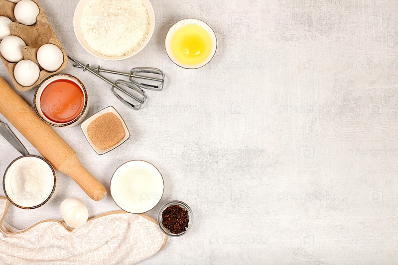 Кулинарные ингредиенты для приготовления пирога и хлеба, рецепт с яйцами, мукой, сахаром, медом, корицей, дрожжами и маслом. Кухонный фон приготовления пищи с пространством для текста. Концепция современной пекарни