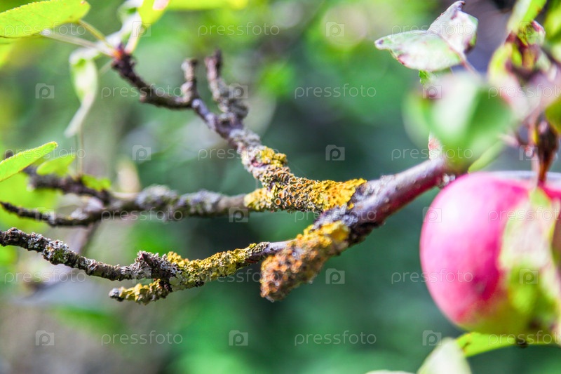 Ветка яблони с яблоком в солнечный день, размытое изображение крупным планом