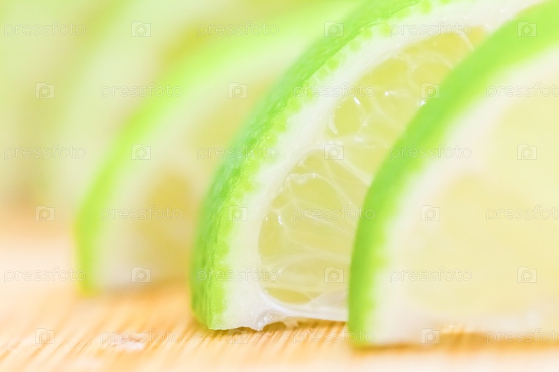 Ломтики лайма на деревянном столе, крупный план размытого фона