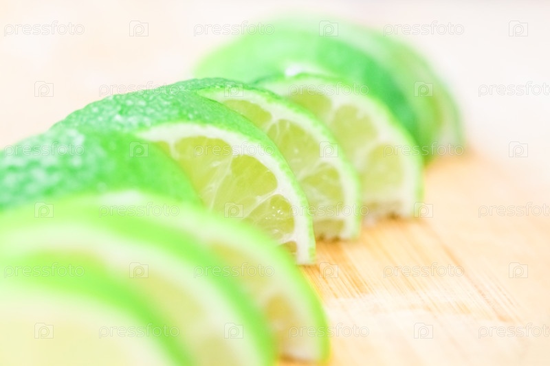 Ломтики лайма на деревянном столе, крупный план размытого фона