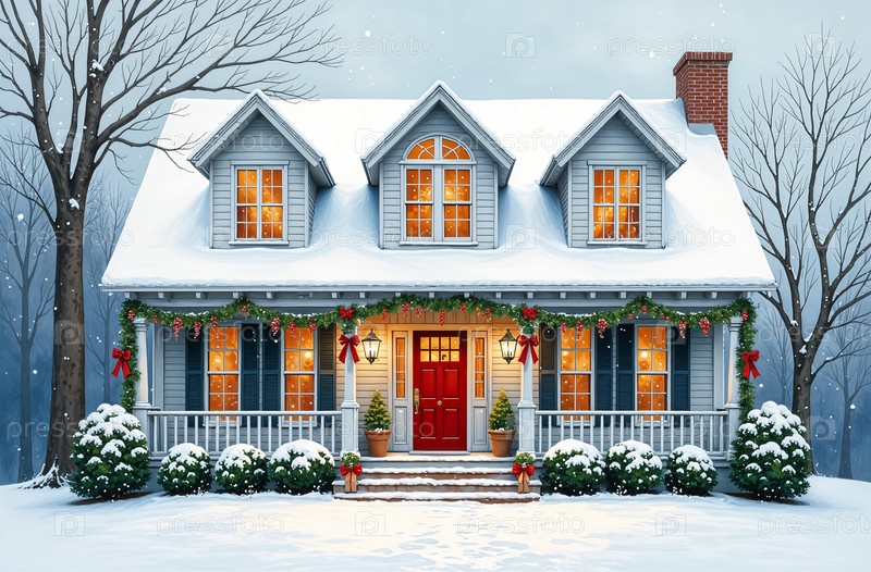 Фасад дома, вечер, снежная зима, рождественская гирлянда, канун Нового года. Создано с помощью искусственного интеллекта