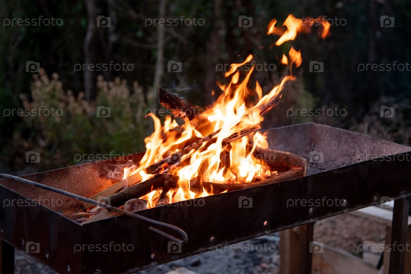 Древесный уголь и дрова горят в гриле для барбекю, подготовка к приготовлению шашлыка
