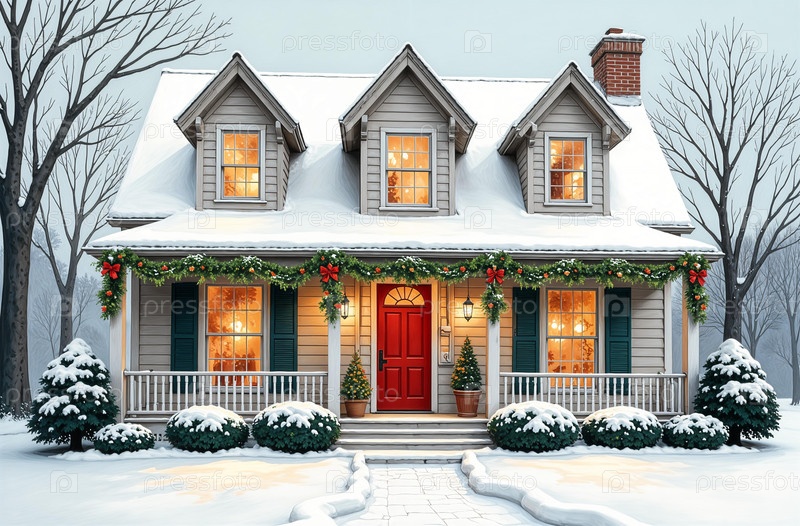 Фасад дома, вечер, снежная зима, рождественская гирлянда, канун Нового года. Создано с помощью искусственного интеллекта