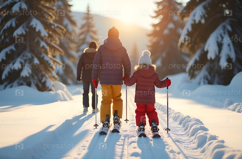 Семейный отдых в канун Нового года, катание на лыжах в заснеженных горах, рождественская елка. Создано с помощью искусственного интеллекта