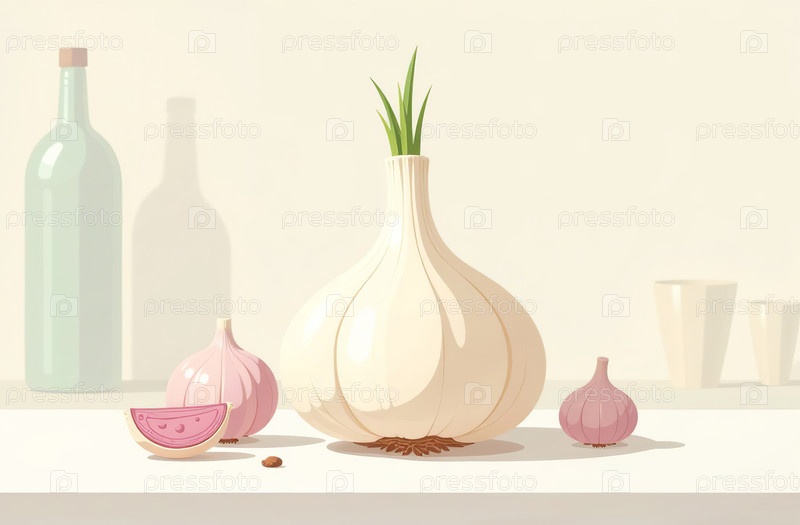 Чеснок на столе, крупный план свежих овощей, яркая кухня. Генеративный искусственный интеллект