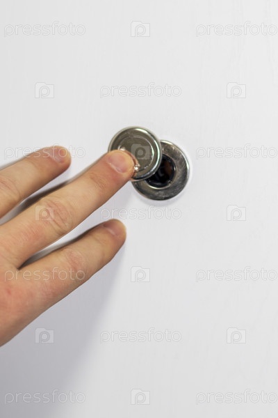 Мужчина открывает дверной глазок. Концепция