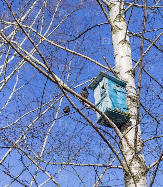 Скворец на ветке березы. Природа