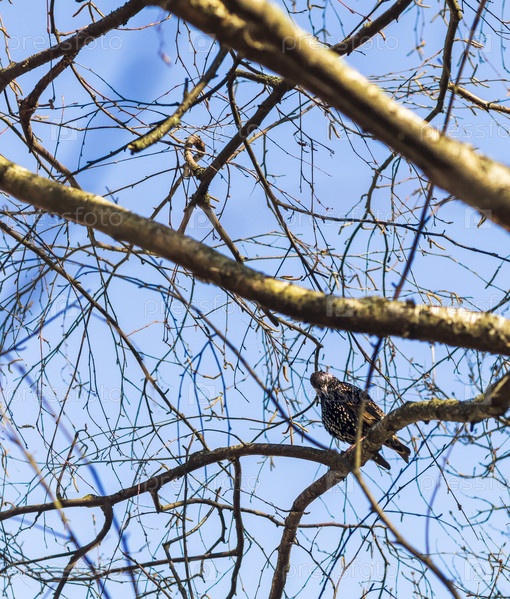 Скворец на ветке березы. Природа