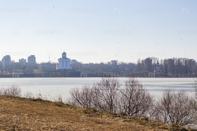 Озеро покрыто талым льдом, на заднем плане город. Сезон