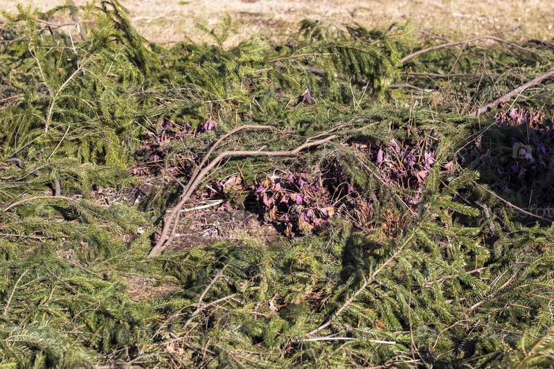 Еловые ветки использовались для защиты цветов от холода в парке. Природа