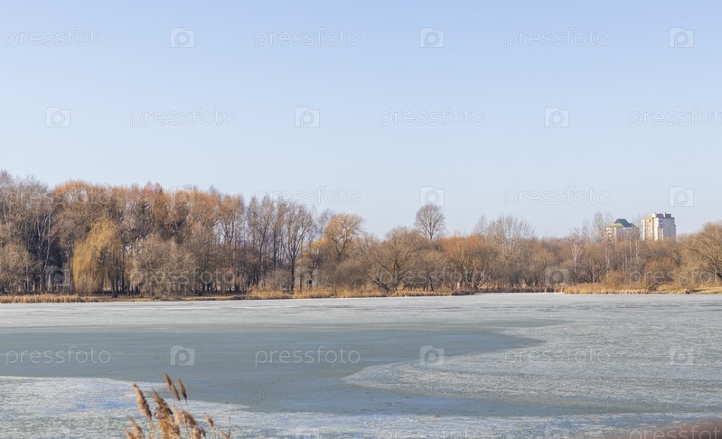 Озеро, покрытое талым льдом, город на заднем плане. На открытом воздухе