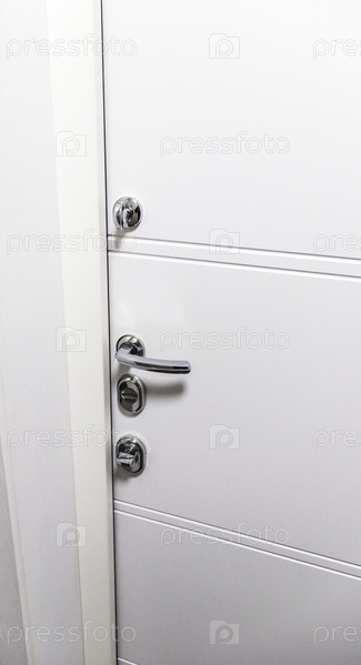 Белая дверь с металлической ручкой и замками как часть дизайна интерьера. Концепция