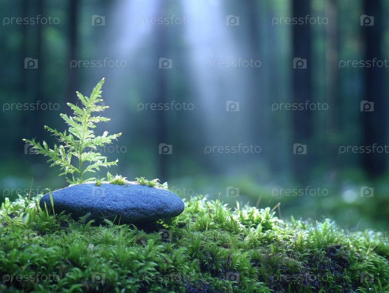 Камень на мху в лесу с солнечными лучами и бликами объектива