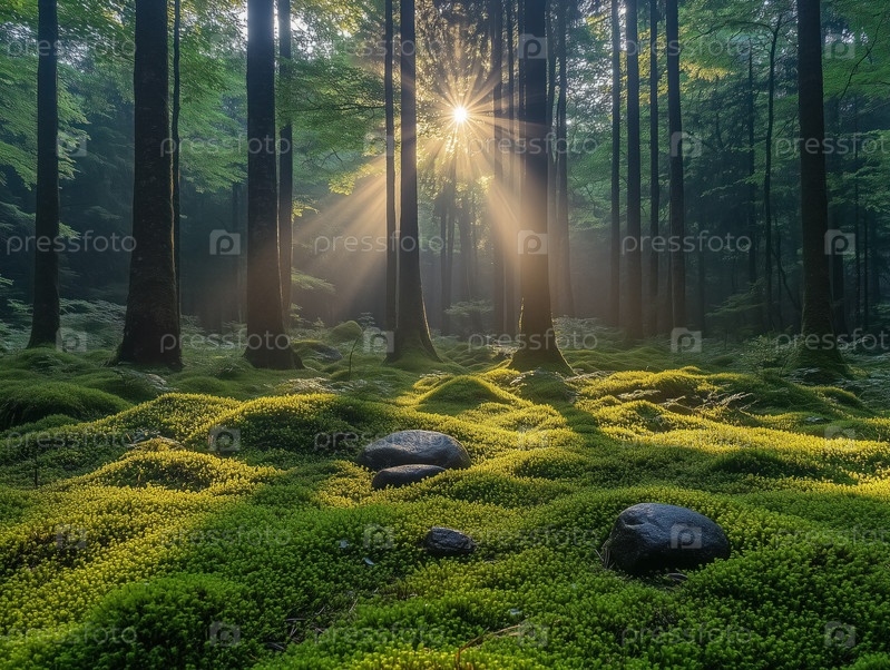Мшистый лес утром с лучами солнца, пробивающимися сквозь деревья