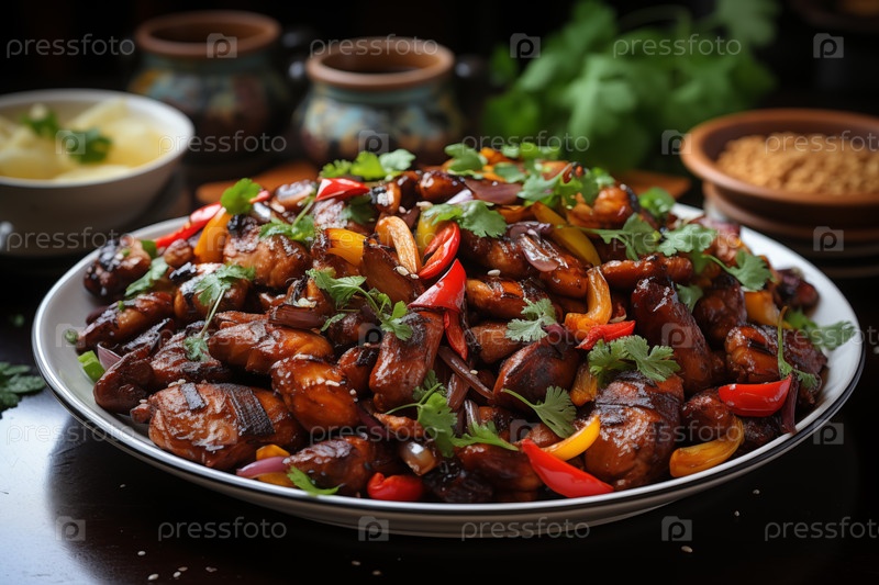 Китайская кухня. Жареная курица с овощами на тарелке