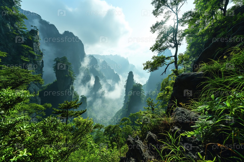 Тропа в горной местности с видом на красивую туманную долину в утренних лучах