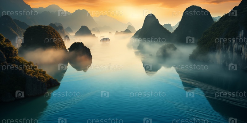 Вид с воздуха на морской залив с карстовыми известняковыми островками и скалами в предрассветном тумане