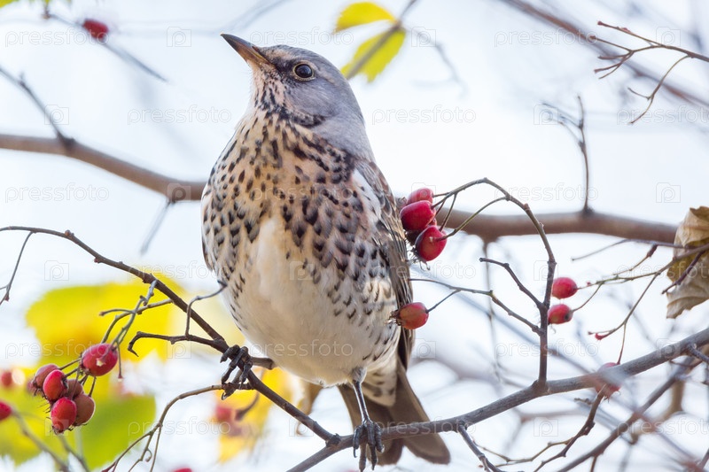 Дрозд на ветке с ягодами