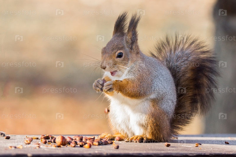 Рыжая белка на ветке осенью