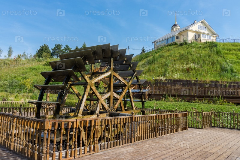 Водяная мельница на фоне церкви