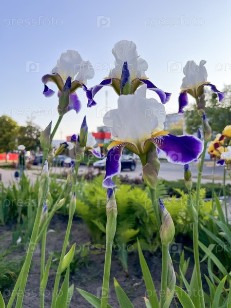 Нежные белые ирисы уобаш цветут весной на клумбе на городской улице