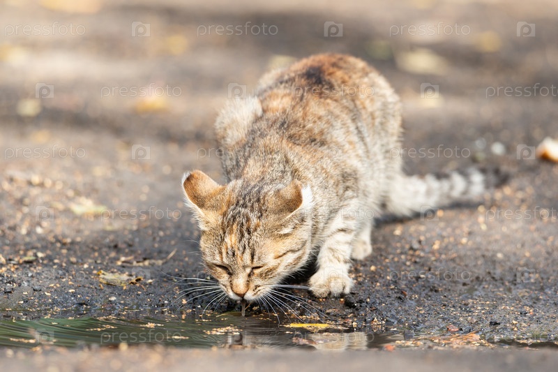 Серый полосатый кот гуляет на поводке по зеленой траве на улице