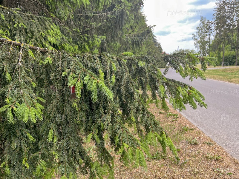 Зеленая ветка ели с шишками на фоне асфальтированной дороги