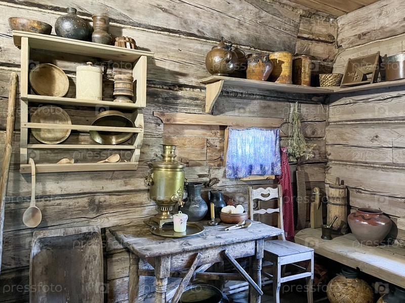 В русской избе есть самовар и посуда на полках