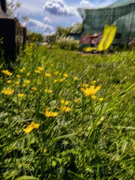 На фоне травы и цветов в сельской местности стоит желтый шезлонг. Размытие в движении. Размытый фокус