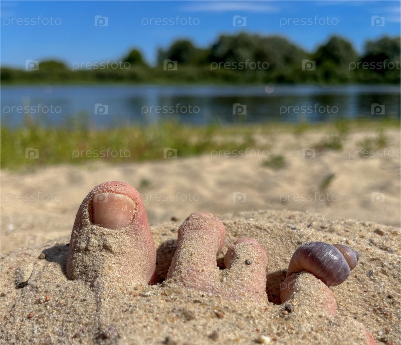 На пляже на пальце ноги женщины лежит речная ракушка
