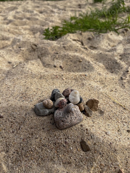 Разноцветные камни лежат на желтом речном песке