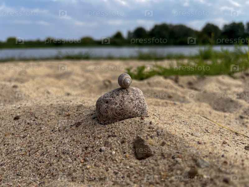Разноцветные камни лежат на желтом речном песке на пляже