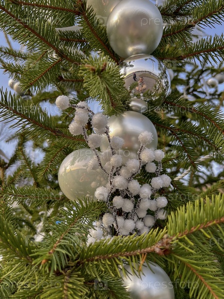 Рождественская елка украшена декоративными елочными игрушками