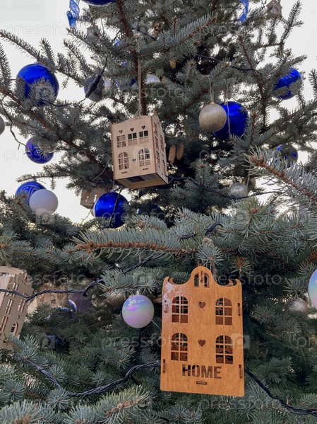 Елка украшена нарядными декоративными елочными игрушками