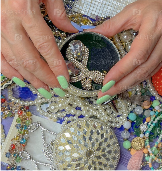 Женские руки с накрашенными ногтями на фоне украшений из серег, бус и браслетов