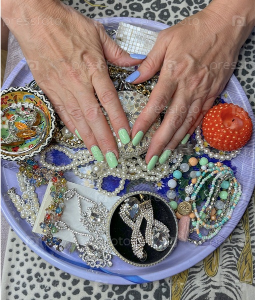 Женские руки с накрашенными ногтями на фоне украшений из серег, бус и браслетов
