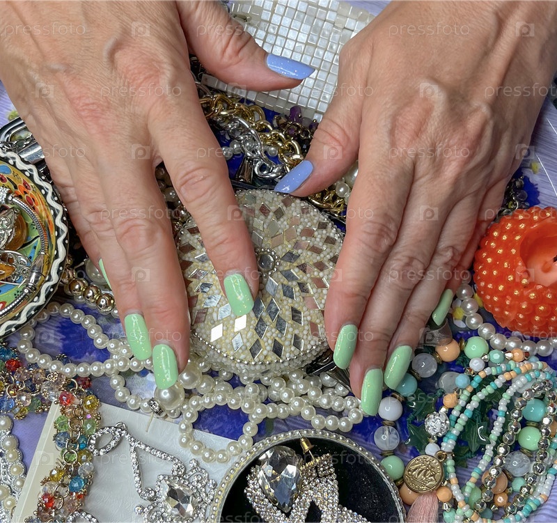 Женские руки с накрашенными ногтями на фоне украшений из серег, бус и браслетов