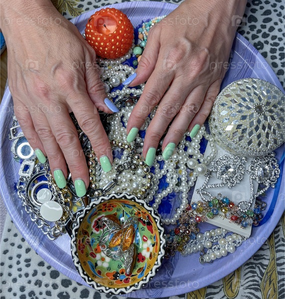 Женские руки с накрашенными ногтями на фоне украшений из серег, бус и браслетов