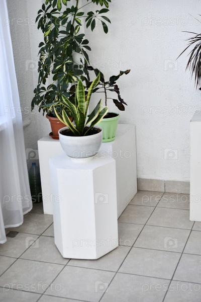 Комнатные растения на белых шкафах. Теплица с зелеными растениями в помещении