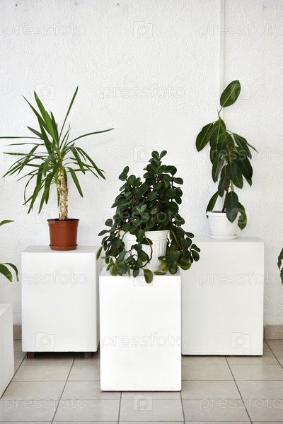 Комнатные растения на белых шкафах. Теплица с зелеными растениями в помещении