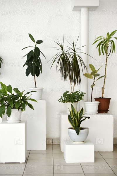 Комнатные растения на белых шкафах. Теплица с зелеными растениями в помещении