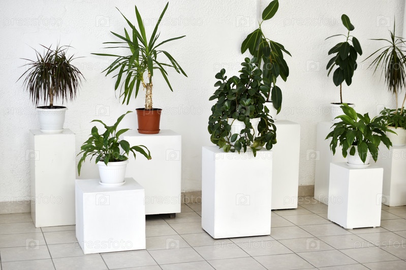 Комнатные растения на белых шкафах. Теплица с зелеными растениями в помещении