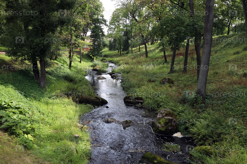 Небольшой ручей среди зелени в парке Ораниенбаум, Санкт-Петербург