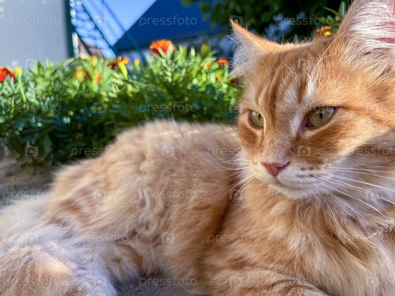 Пушистый рыжий кот отдыхает в саду