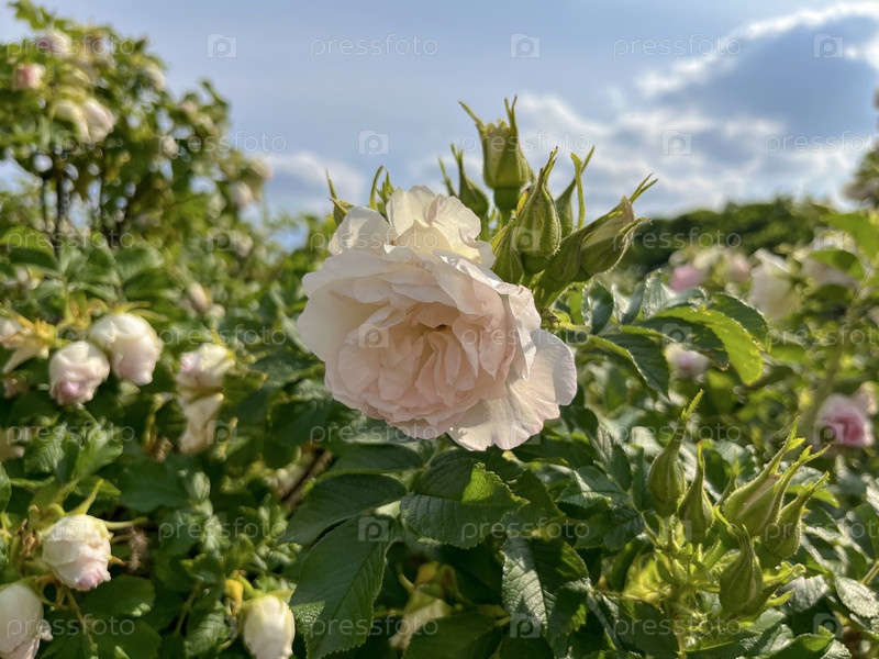 Плетистая роза цветет на городской клумбе