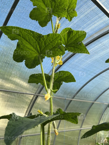Летом в теплице закрытого грунта цветет огурец