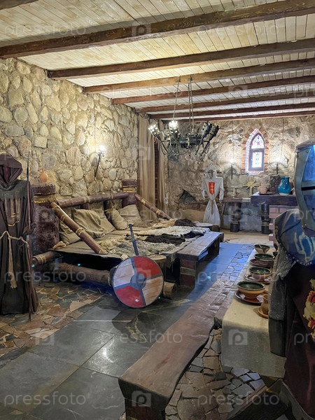 На фоне каменной кладки изображены рыцарские доспехи